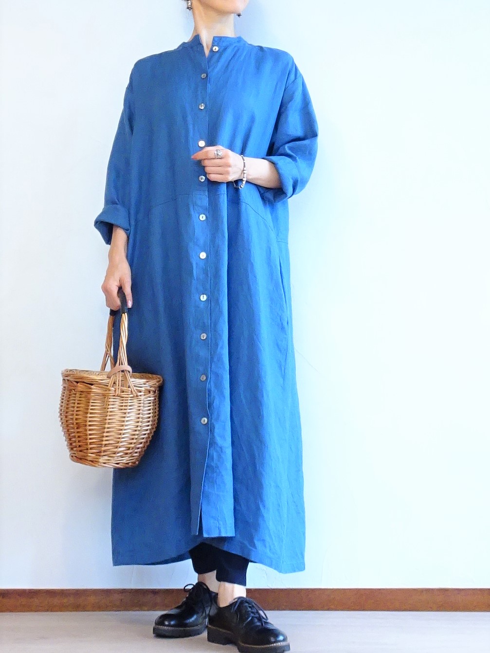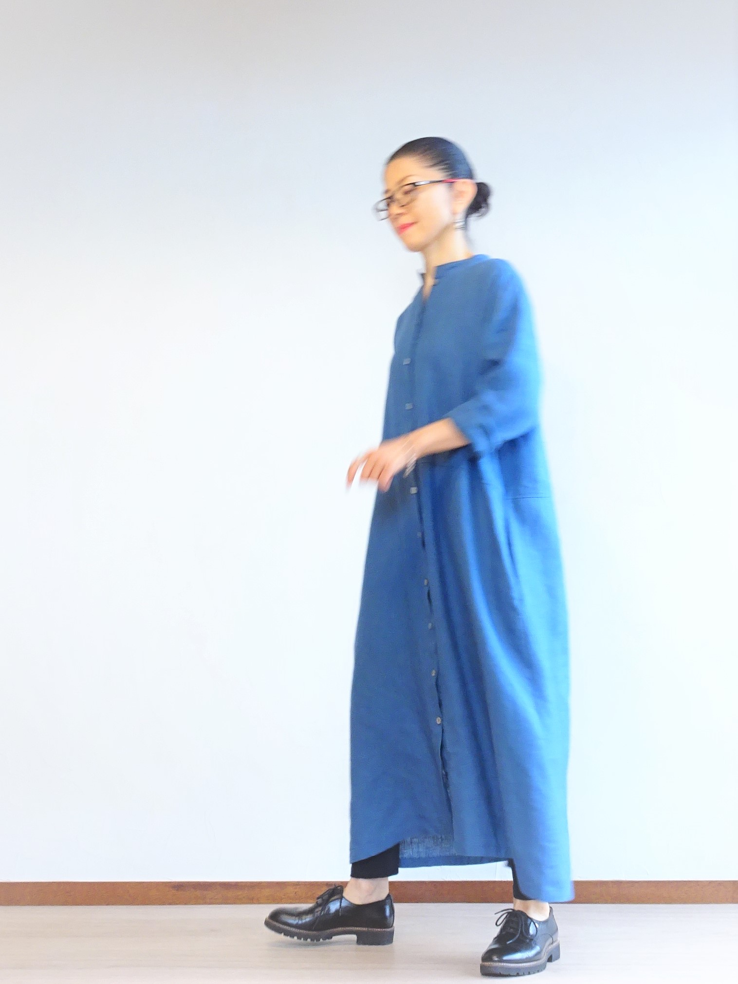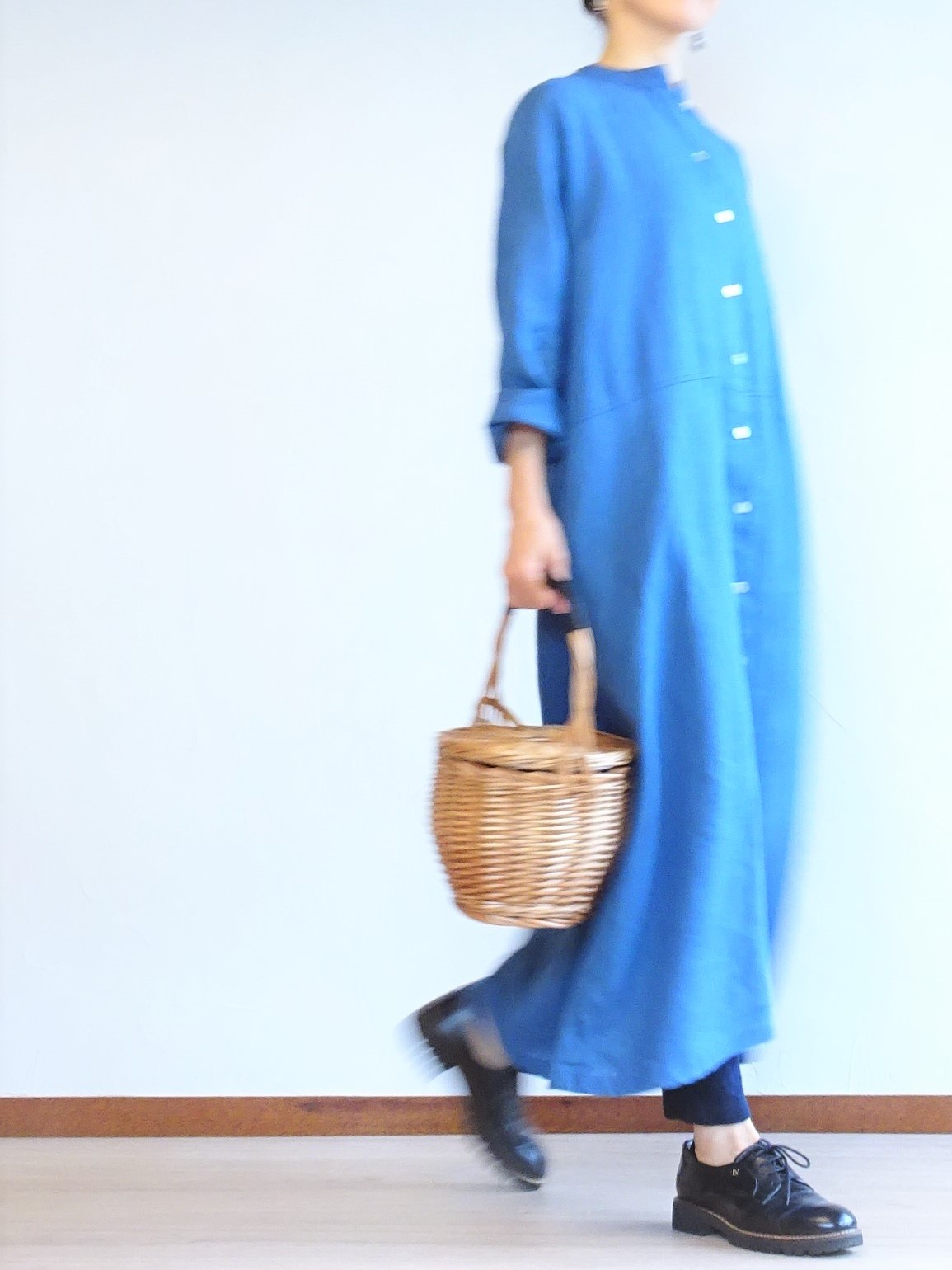 青いリネンのワンピースとネイビーのカットソーパンツのコーデ。