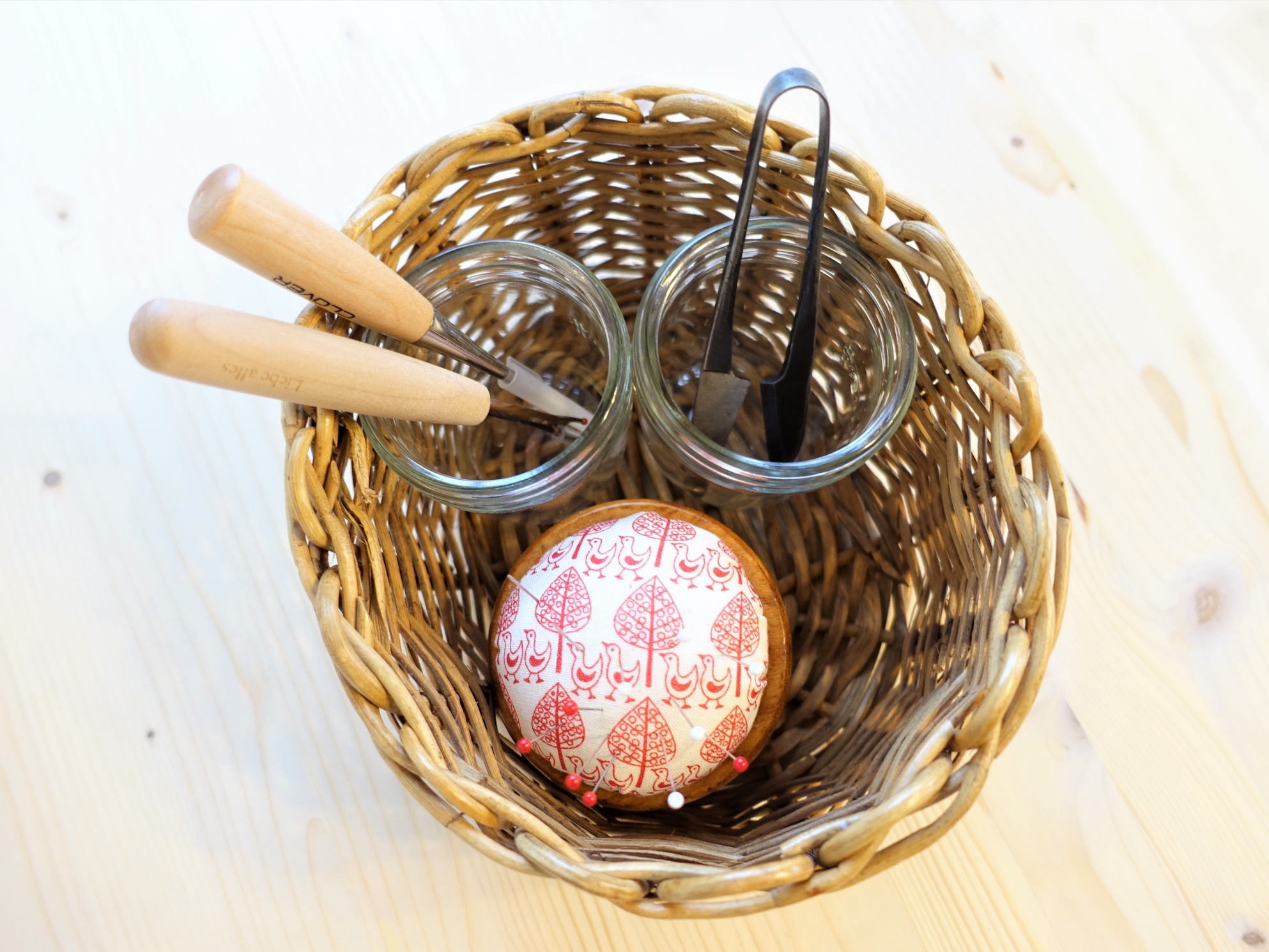 裁縫かごはお花をいただいた時のかごをリユースしたもの‥