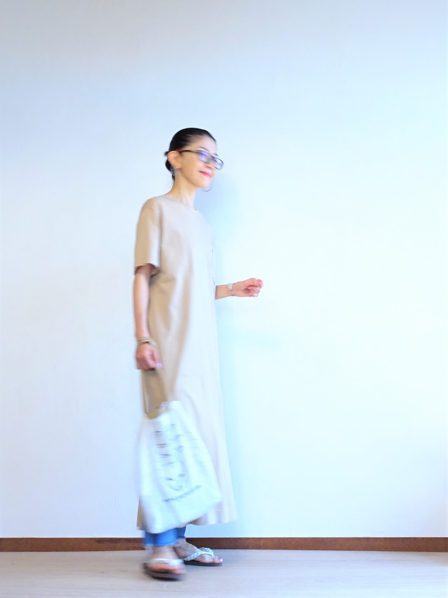 ベージュのカットソーロングワンピースのコーデ。