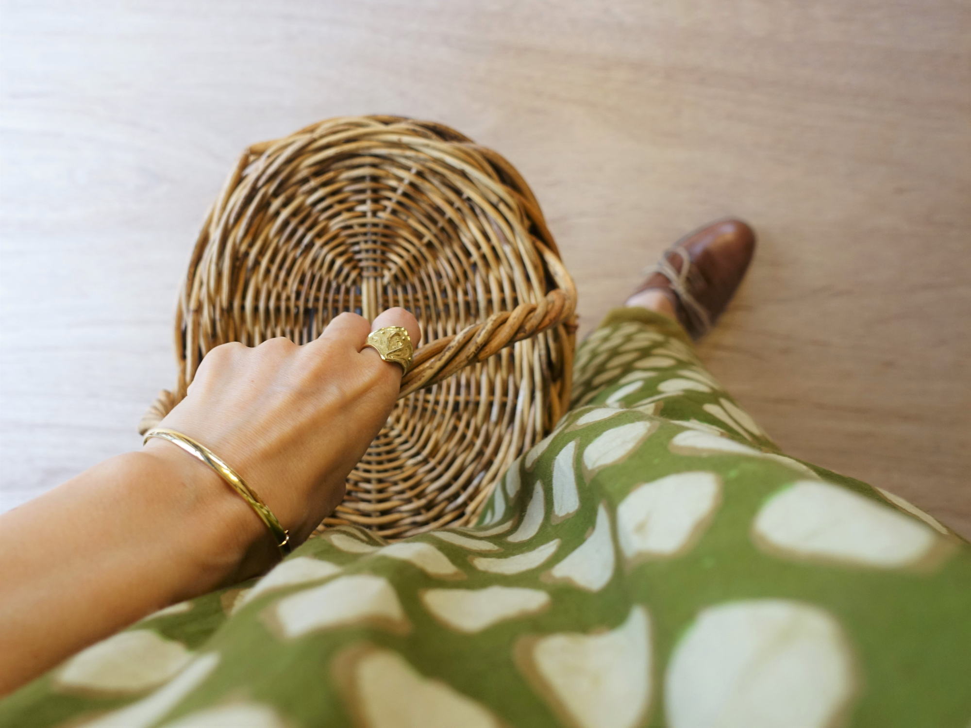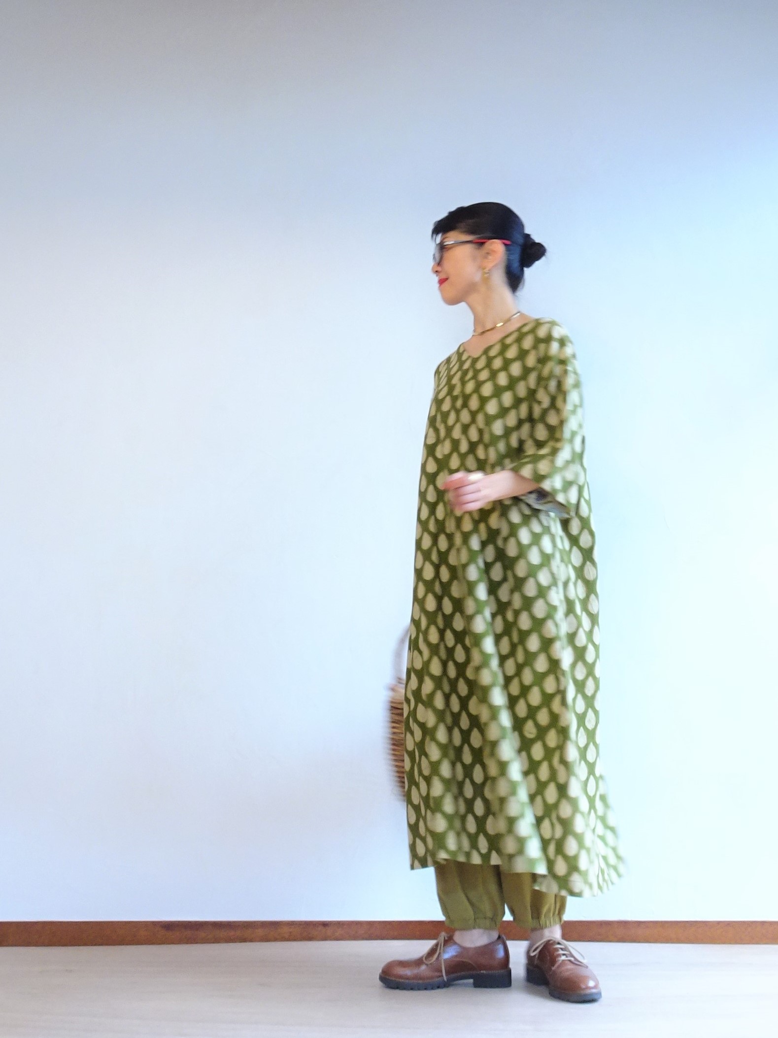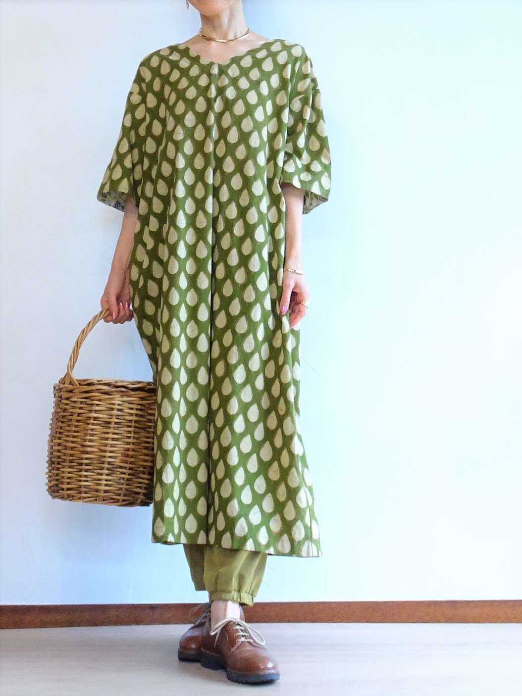 抹茶色のブロックプリントのエスニックワンピースのコーデ。