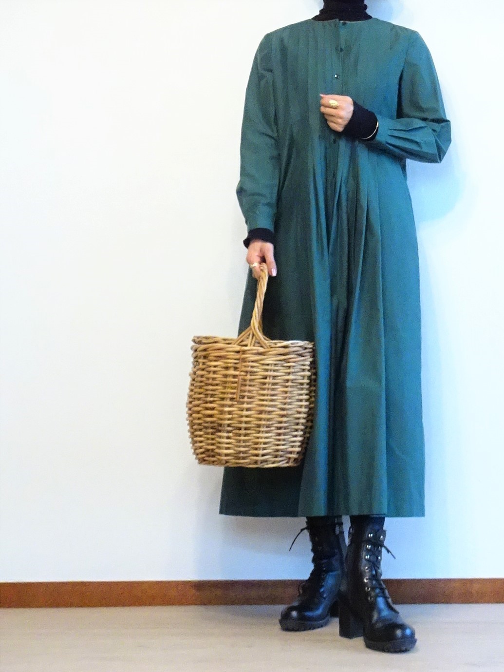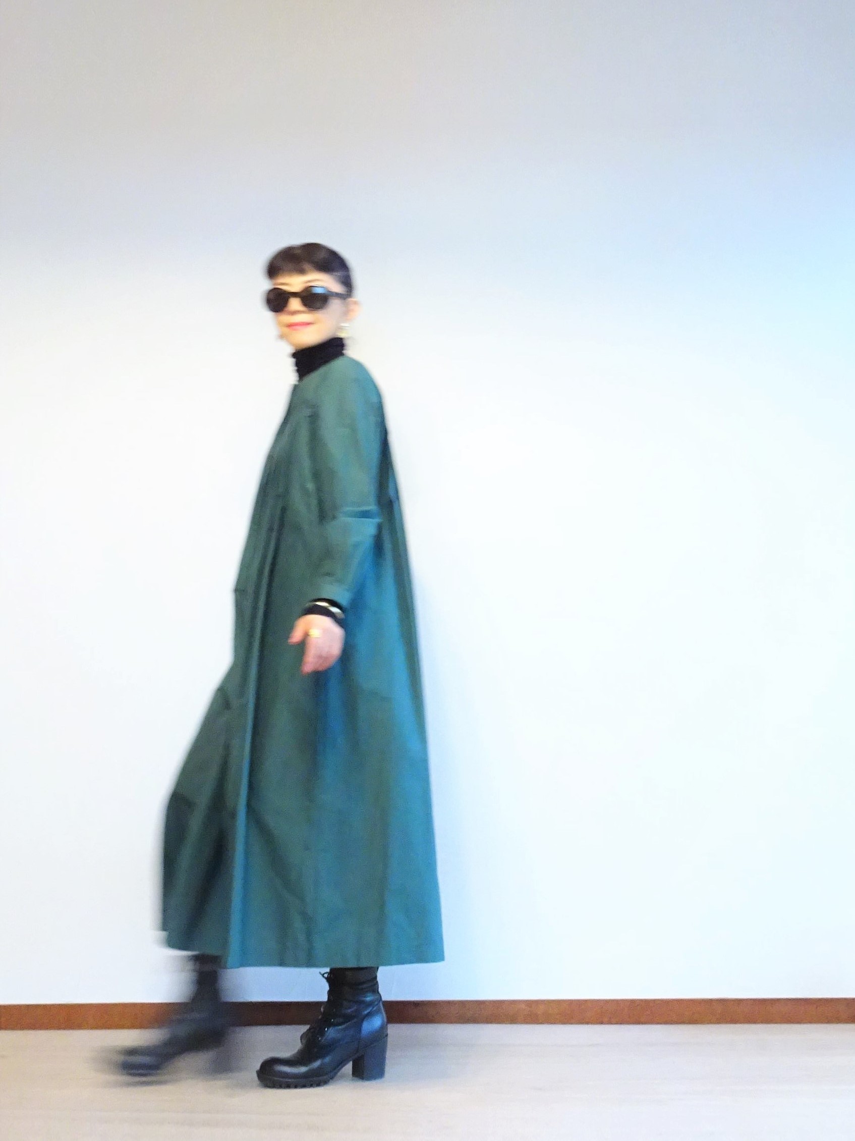 黒いハイネックの上にグリーンのタックワンピースを重ね着~